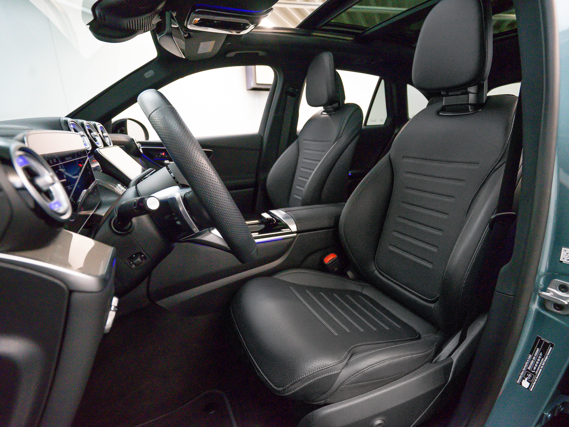De auto is uitgevoerd in Verdezilver metallic en voorzien van het sportieve AMG Line Exterieur met Nightpakket en 20 inch AMG-velgen. Het interieur straalt klasse uit met kunstleder zwart/antraciet, AMG-details, sfeerverlichting Premium Plus en een panoramaschuifdak.